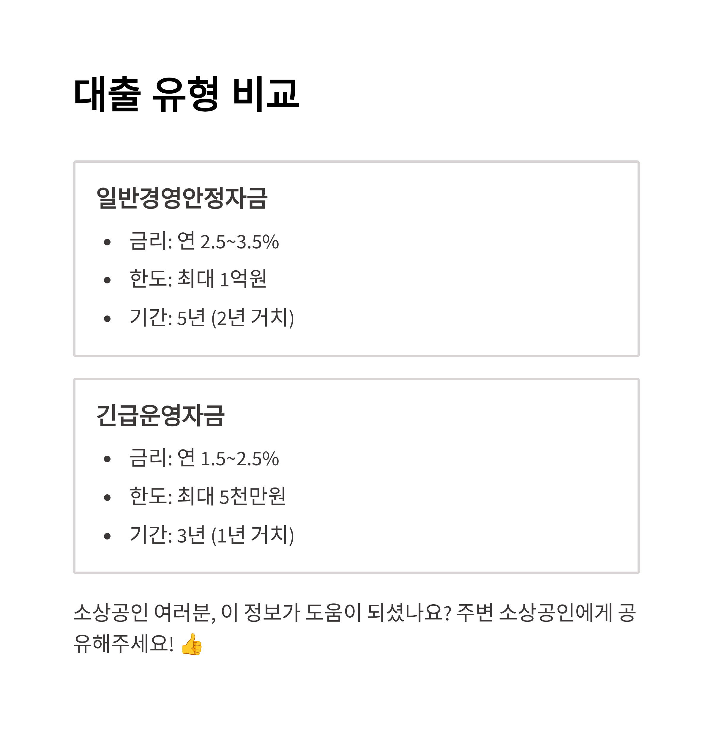 - 긴급 운영자금: 일시적 매출 감소 시 단기 자금 지원