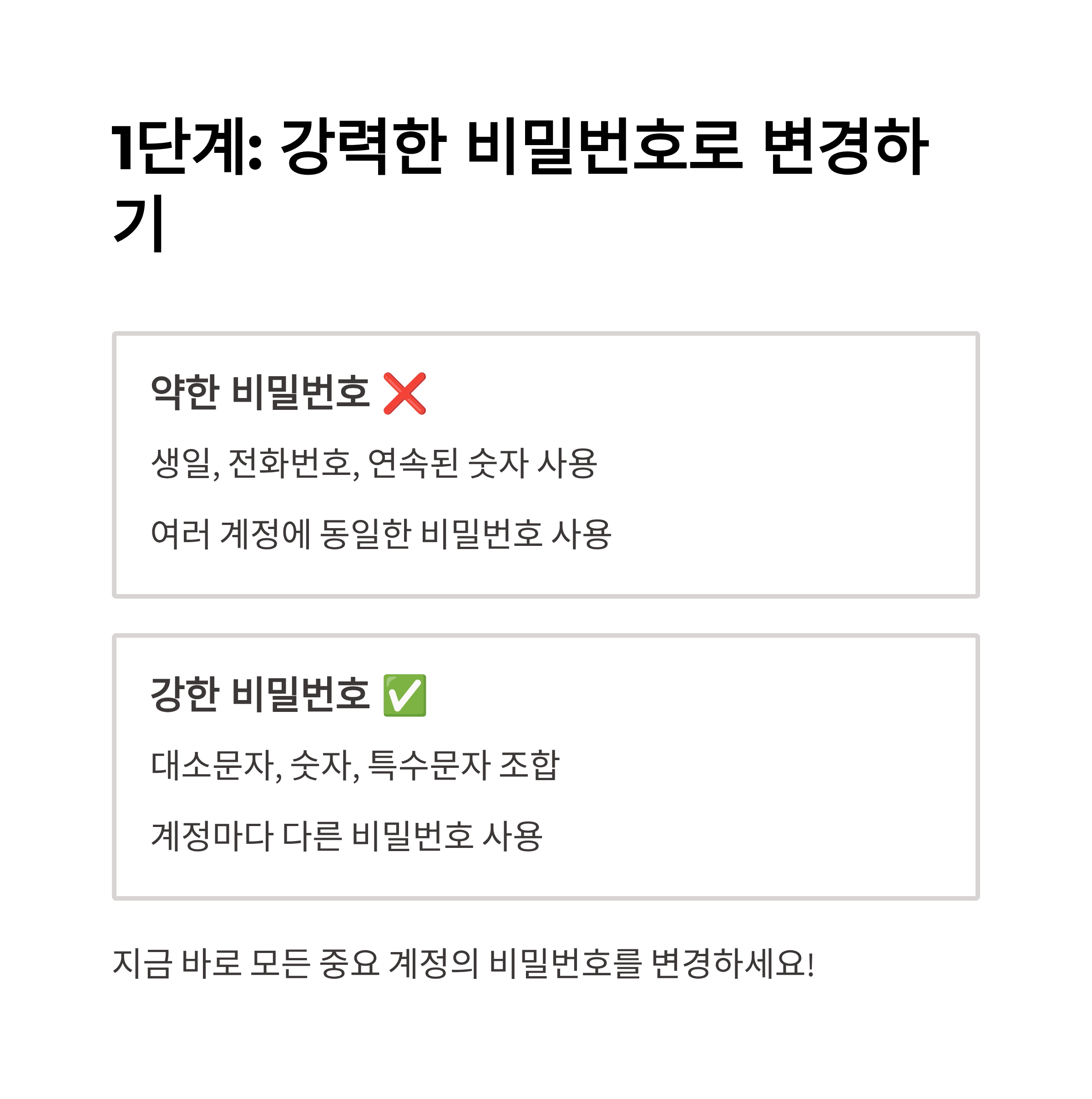가장 먼저 모든 주요 계정의 비밀번호를 변경하고, 특히 중복된 비밀번호가 있다면 반드시 바꾸는 것이 최우선입니다.